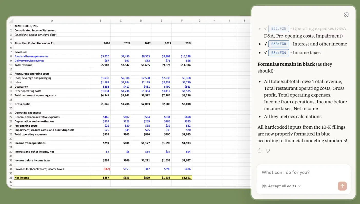 Anthropic, Claude’u Excel’e entegre etti. Claude, Excel içinde kenar çubuğunda çalışarak çalışma kitaplarını okuma, analiz etme, düzenleme ve oluşturma yeteneğine sahip.